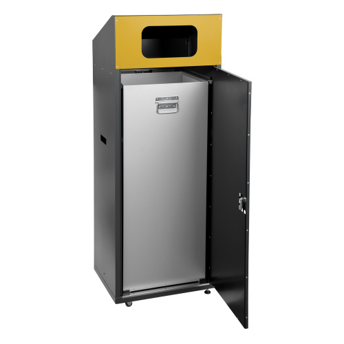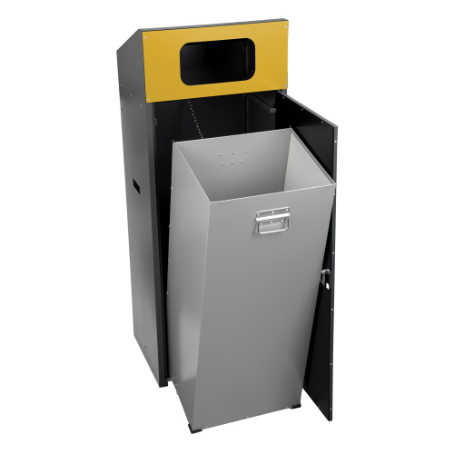 - Standardně je koš dodáván s ocelovou lakovanou vložkou o objemu 120 l s možností zajištění na řetízku.